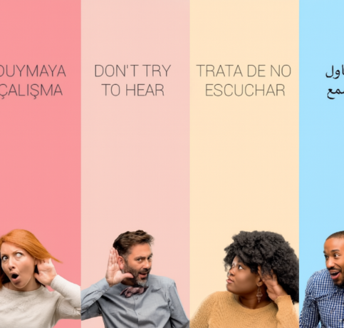 Multilingual wallpaper design encouraging silence, featuring diverse people and pastel color panels visually.